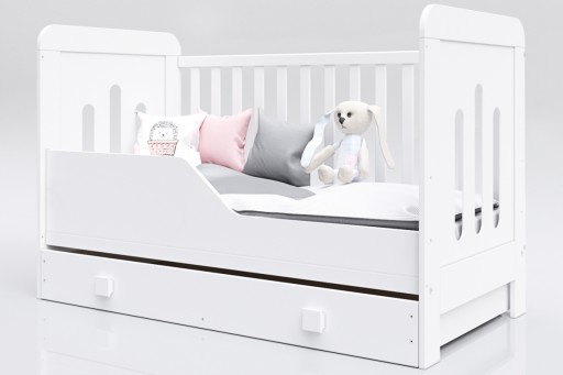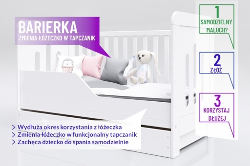 Łóżeczko o wymiarach 140x70 jest przeznaczone dla dzieci do 5 roku życia. Barierka zabezpieczająca w tym modelu ujęta jest w cenie. Z łóżeczka możemy zrobić tapczanik-sofkę którą sprawdzi się na długie lata. Wystarczy zdjąć jeden z boków i zamontować barierkę (barierka ujęta w cenie podstawowej).