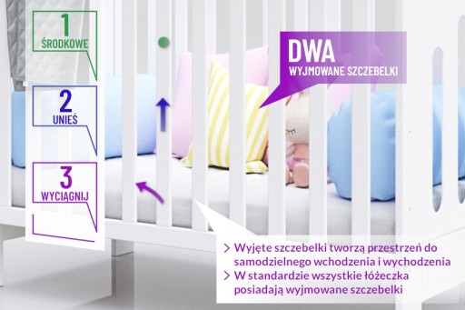 W łóżeczku z płaskimi szczebelkami mamy zawsze dwie wyjmowane sztuki. Gdy maluszek jest już na tyle samodzielny, aby swobodnie chodzić, można wyjąć szczebelki, pozwoli mu to na bezproblemowe poruszanie się z i do łóżeczka.