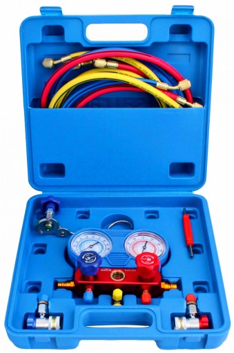 OPIS PRZYRZĄDU Zestaw przeznaczony jest do obsługi systemów klimatyzacji z czynnikiem R134a. Za jego pomocą możliwe jest sprawdzenie ciśnienia w układzie klimatyzacji jak również dodanie lub usunięcie czynnika chłodzącego.