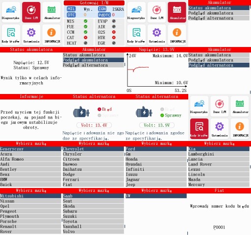 - Odczyt błędów: P0, P2, P3, U0, oraz kody charakterystyczne danej marki: P1, P3, U1
