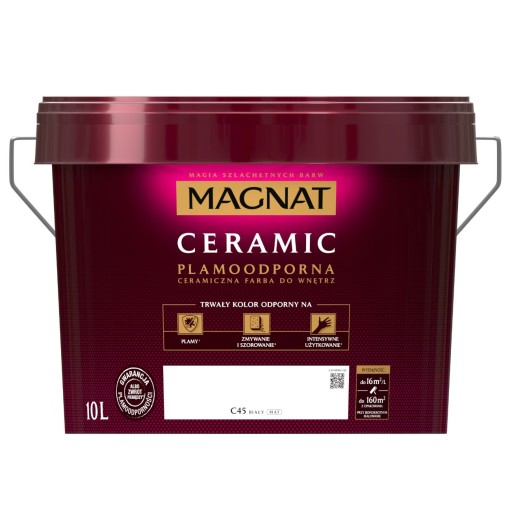 Magnat CERAMIC to farba 3. generacji, którą wyprodukowano z wykorzystaniem innowacyjnej technologii CERAMIC SYSTEM, która bazuje na ceramicznych komponentach oraz najwyższej jakości żywicach i pigmentach. Ta unikalna formuła zapewnia farbie MAGNAT CERAMIC ponadprzeciętne parametry odporności na szorowanie i wielokrotne zmywanie oraz sprawia, że powłoki farby nie absorbują zabrudzeń i szczególnych plam.