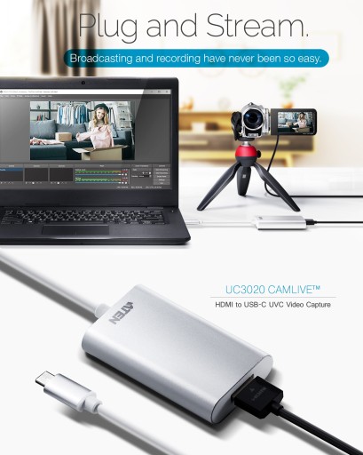 ATEN CAMLIVE to urządzenie przechwytujące sygnał HDMI UVC i przesyłające niezakodowany sygnał bezpośrednio do komputera przez USB-C lub Thunderbolt 3, bądź USB-A (za pomocą adaptera). UC3020 jest kompatybilny z najnowszą specyfikacją USB 3.1 Typu-C.