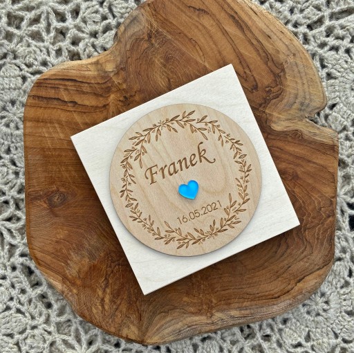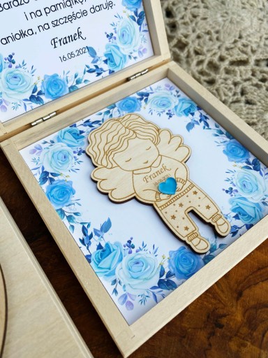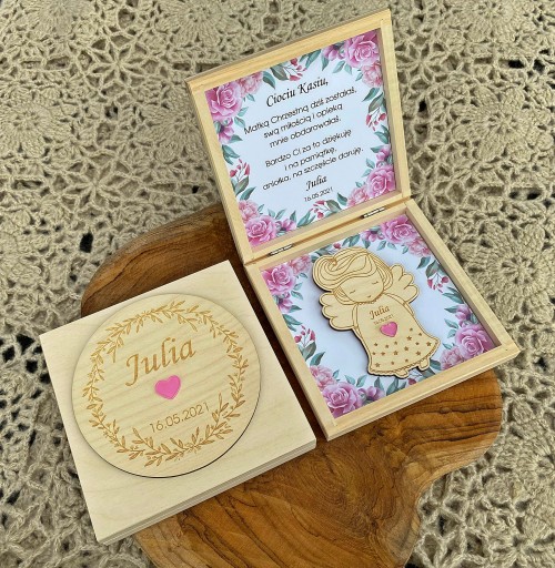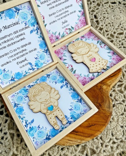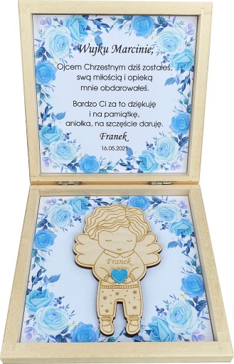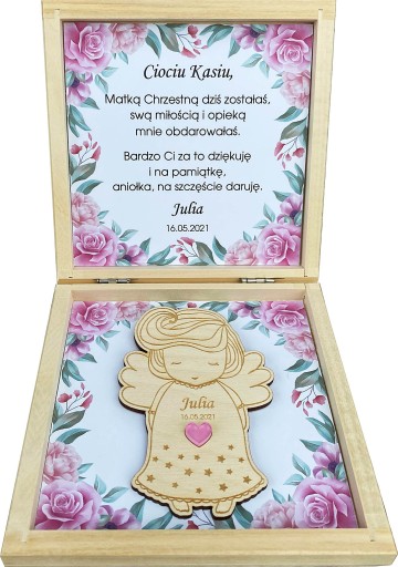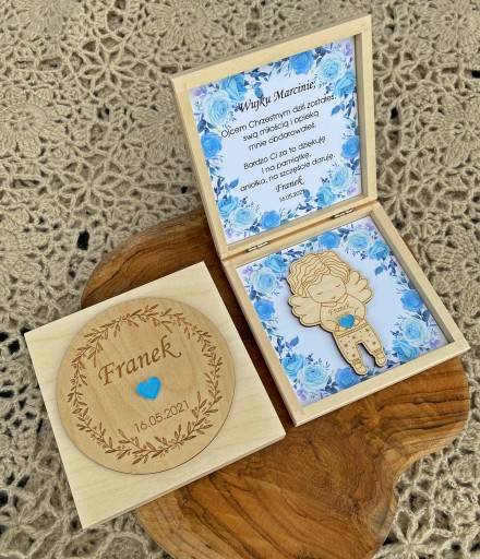 Drewniane pudełko zawiera spersonalizowany tekst oraz drewnianego aniołka z magnesem.