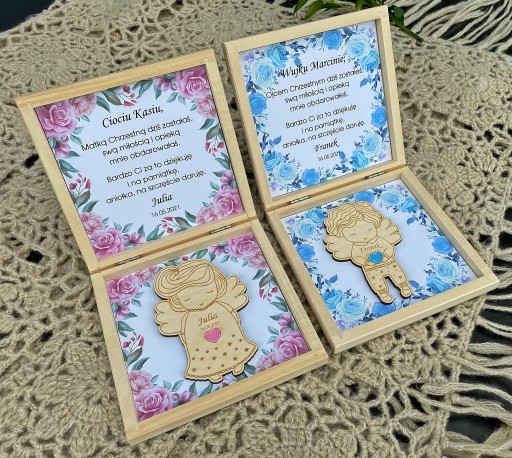 W środku pudełka spersonalizowane podziękowania oraz drewniany aniołek z przyklejonym neodymowym magnesem.