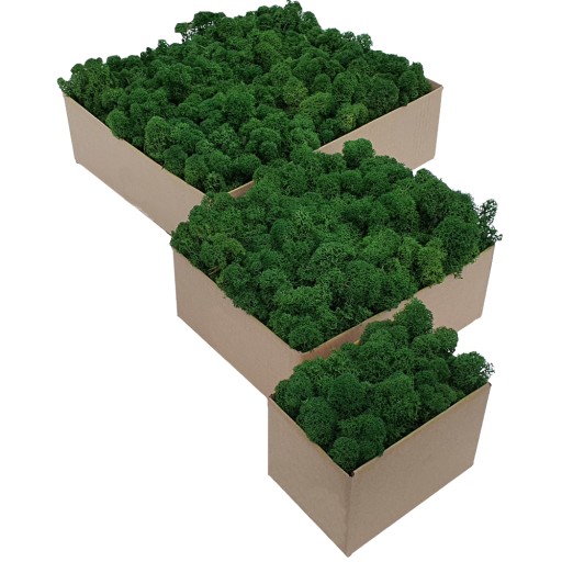Chrobotek ciemna zieleń o butelkowym wybarwieniu w odcieniu pięknej, głębokiej leśnej zieleni. Porost wysokiej jakości, z niewielką ilością zanieczyszczeń w strukturze. Produkt pakowany w karton o gramaturze 600g w jednej warstwie, estetycznie ułożony. Mech oczyszczony, po wyjęciu z kartonu gotowy do pracy. Wydajność jednego kartonu mchu chrobotka 600g to od 0,08 do 0,11 m2 powierzchni (do 33x33cm).