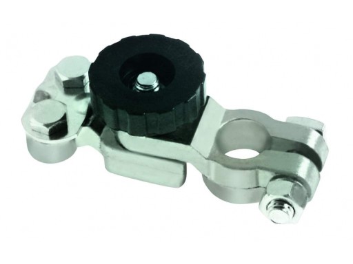 Uniwersalna klema wyposażona w rozłącznik spełniający funkcje hebla - po odkręceniu rozłącza obieg i nie powoduje poboru prądu z akumulatora bez potrzeby zdejmowania całej klemy.