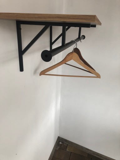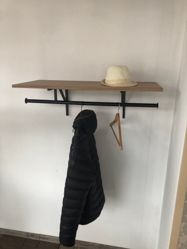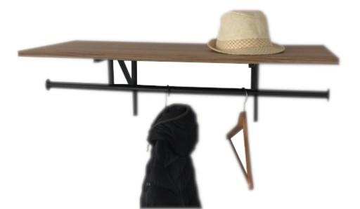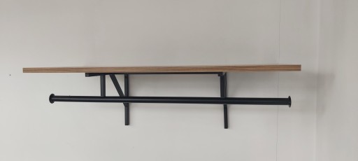 Wieszak z półką wykonany z metalu malowanego proszkowo w kolorze czarnym z dodatkiem płyty meblowej .