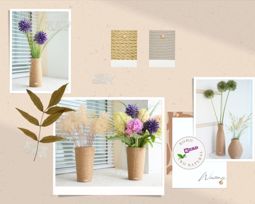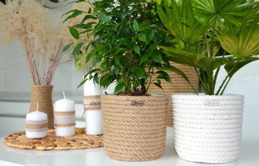 - na wierzchu elementy ozdobne: stworzone z grubego sznura jutowego pochodzenia naturalnego. Juta jest to ekologiczny surowiec pochodzenia roślinnego o naturalnej barwie (niebarwiony)
