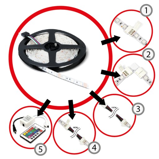 Złączka umożliwia połączenie dwóch odcinków taśmy LED RGB o szerokości 10mm, umożliwiając umieścić te odcinki w max odległości od siebie wynoszącej 15cm