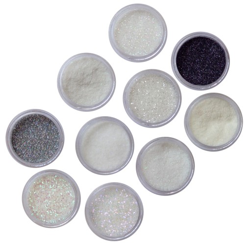 Zestaw 10 efektownych pyłków do zdobień manicure.