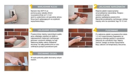 Cegły elastyczne - płytki dekoracyjne SDP-C mogą być klejone wyłącznie klejem SDP-K. Przed użyciem korzystnie jest klej wymieszać. Klej SDP-K nanosić pacą zębatą 4 mm na pow. około 1-2 m2 Zużycie 2,5 kg/m2.