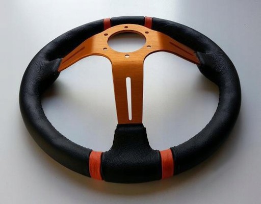 kierownica bardzo solidnie wykonana. Lekka, Grube ramiona - nie wygina się tak jak tanie chińczyki po 150zł. Skóra naturalna, średnica 35cm. Odsadzenie 8cm. Gruba i mocna.