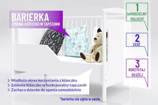- Barierkę zabezpieczającą - nadaje łóżeczku nową funkcjonalność. Barierkę stosuję się gdy dziecko samodzielnie potrafi wchodzić do łóżeczka tworząc w ten sposób ślicznie wyglądający tapczanik.