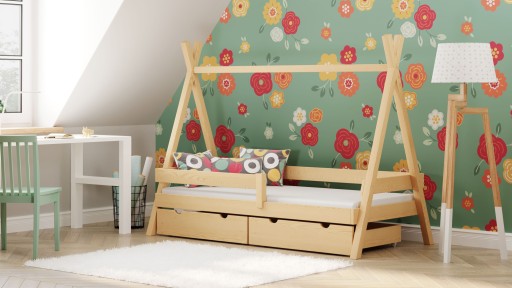 Z TIPI PLUS nie ma czasu na nudę! Prezentowany model to pojedyncze łóżko dziecięce, w całości wykonane z drewna sosnowego. To wyjątkowe łóżko przystosowane jest do zamontowania szuflady w celu przechowywania pod łóżkiem pościeli, książek, czy gier. Jego konstrukcja nawiązuje do Wigwamu, zachęcając do zabawy w stylu indiańskim. Konstrukcja daje możliwość ozdobienia go dodatkami, które spersonalizują wygląd i uczynią go wyjątkowym. TIPI PLUS zachęca do puszczenia wodzy fantazji!