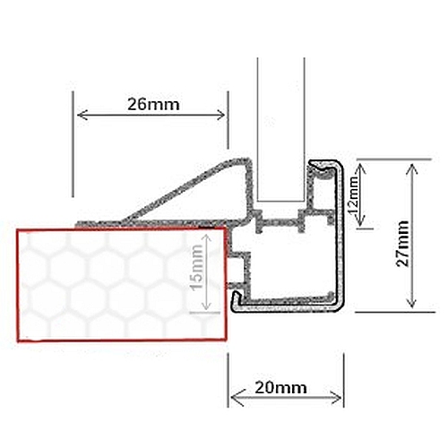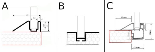 C: Prowadnica FRAME (żaluzja licuje z frontami kuchennymi, krawędzie korpusu szafki są zakryte na 15mm)