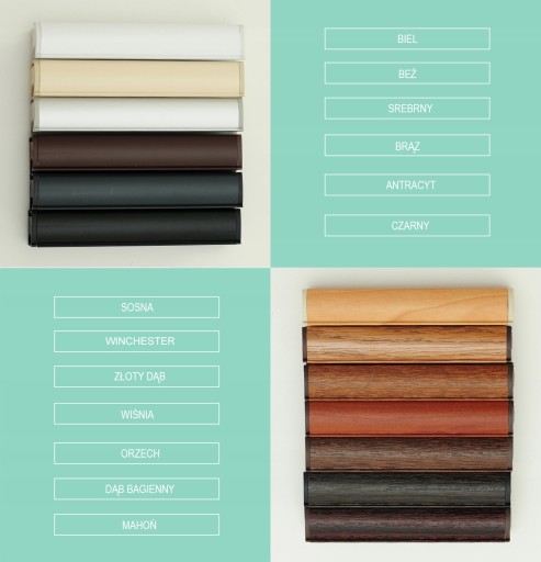 Prowadnice są aluminiowe w 3 kolorach: biały, srebrny i sosnowy.