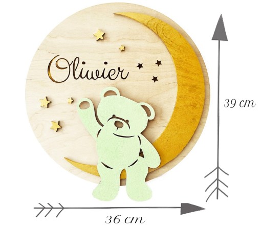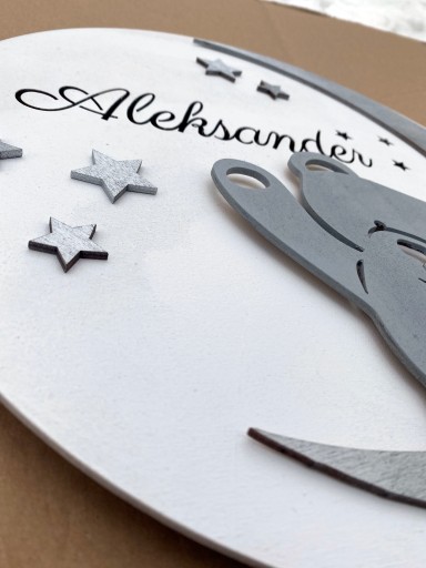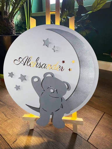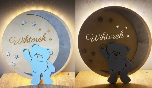 Lampka wykonana z drewna pięknie prezentuje się na ścianie w dzień, natomiast zapalając led w nocy zamienią się w piekną lampkę nocną. Lampki są starannie wykonywane przez nas. Przymocowana z tyłu taśma rozświetla dookoła lampkę, gwiazdki oraz imię Twojego maluszka bądź wybrany przez Ciebie napis. Taśma zasilana jest bateryjnie.