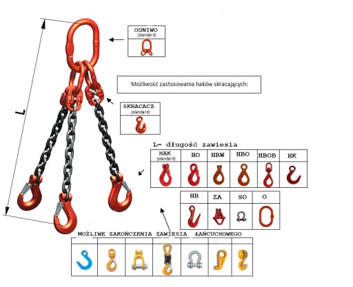Zawiesia mogą mieć ustaloną na życzenie[patrz inne nasze oferty allegro] długość i konfigurację wyposażenia w elementy końcowe jak haki, ogniwa, łączniki.