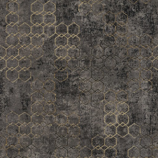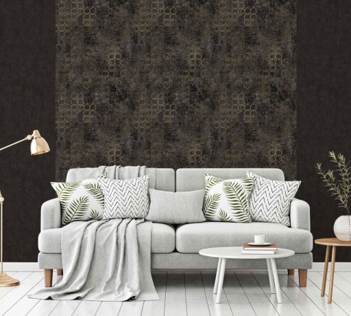 Tło tapet wygląda jak ściana z lekko wypukłego tynku, pomalowana-przetarta grafitowo-czarnymi farbami;
