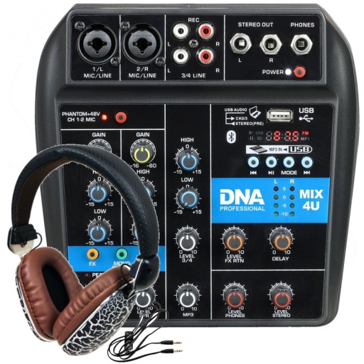 DNA MIX 4U to lekki i bardzo mały analogowy mikser estradowy obsługujący standard bezprzewodowej komunikacji Bluetooth, wyposażony w port USB i obsługę plików MP3 oraz zasilanie Phantom +48V. Urządzenie obsługuje 4 kanały. Posiada 2 wejścia sygnałowe typu combo XLR/jack, które dzięki specjalnemu przełącznikowi mogą pracować w trybie mono lub jako jeden kanał stereo, oraz stereofoniczne złącze RCA (cinch) dla kanału 3 i 4. Użytkownik może kontrolować poziom głośności każdego z kanałów, użyć 2-pasmowego korektora tonów wysokich i niskich, a także podbić sygnał na wejściach 1 i 2. Dodatkowo mikser audio posiada wbudowany efekt opóźnienia (delay), którego częstotliwość i poziom nałożenia na dany kanał możemy w łatwy sposób kontrolować. Sygnał wyjściowy może być podawany do głośników lub monitorowany na słuchawkach. Najmocniejszą stroną tego miksera dźwięku jest port USB z wbudowanym odtwarzaczem plików MP3, umożliwiający podłączenie do konsoli laptopa, tabletu, zewnętrznych kart pamięci lub innych urządzeń wysyłających sygnał audio.