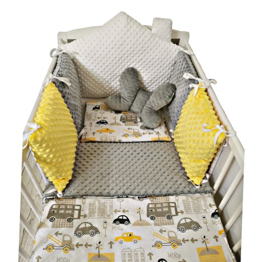 Każda poduszka ma doszyte troczki, dzięki którym łatwo i bezproblemowo można zamocować ochraniacz do łóżeczka. Ochraniacz modułowy można wykorzystać również w łóżeczku starszego dziecka, może on pełnić np. funkcję izolacyjną od ścian.
