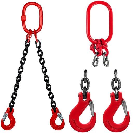 Zawiesie łańcuchowe 2-cięgnowe zakończone ogniwem zbiorczym /wym. ogniwa 110 x 60 mm / wraz hakami widełkowym z zabezpieczeniem przed wypięciem cięgna zabezpieczoną zapadką.