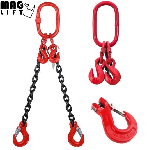Zawiesie łańcuchowe 2-cięgnowe zakończone ogniwem zbiorczym /wym. ogniwa 110 x 60 mm / wraz z hakami skracającymi oraz z hakami widełkowym z zabezpieczeniem przed wypięciem cięgna zabezpieczoną zapadką.