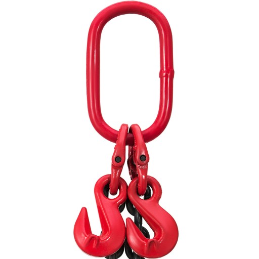 Zawiesie łańcuchowe 2-cięgnowe zakończone ogniwem zbiorczym wraz z hakami skracającymi oraz z hakami widełkowym z zabezpieczeniem przed wypięciem cięgna zabezpieczoną zapadką