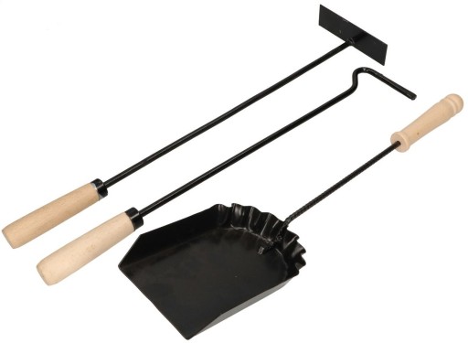 Zestaw wykonany z grubej blachy malowanej proszkowo na kolor czarny z drewnianym uchwytem. Używany do węgla, popiołu, trotu itp.