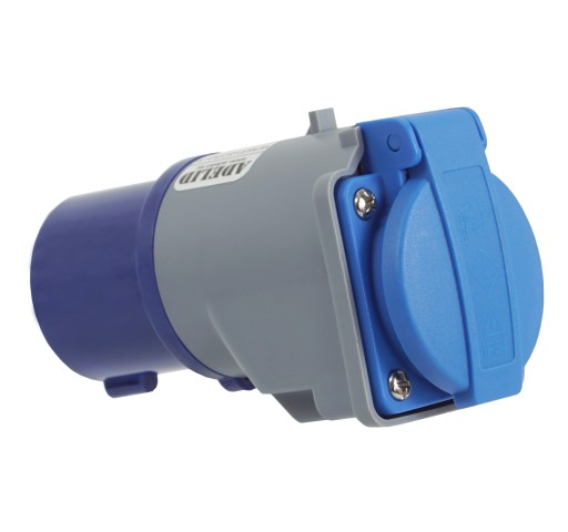 Z jednej strony adaptera znajduje się gniazdo z uziemieniem z bolcem 230V/250V, a z drugiej wtyczka z bolcami typu CEE (część męska).