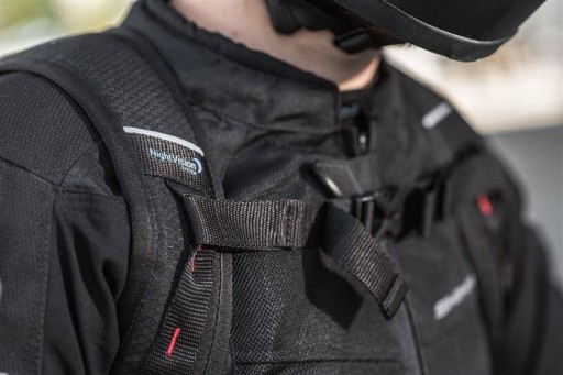 Dyskretne panele odblaskowe Night Vision System rozmieszczono tak, aby motocyklista był widoczny na drodze z każdej strony. W celu zapewnienia doskonałej widoczności po zmroku projekt paneli odblaskowych oparty został na mikrosferycznych drobinkach szkła. Dodatkowo ich dyskretny kształt zgrabnie wpisuje się w elementy konstrukcyjne plecaka. Bryzgoszczelny materiał, z którego wykonano AYRO, sprawia, że zawartość plecaka chroniona jest przed drobnym deszczem i wilgocią, a powłokę zewnętrzną czyści się z łatwością z wszelkich zabrudzeń.