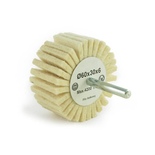 Ściernica listkowa wykonana z promieniście ułożonych lamelek filcu na trzpieniu stalowym o średnicy 6mm. Uniwersalny trzpień mocujący 6mm umożliwia pracę zarówno z każdą wiertarką jak i wkrętarką wyposażoną w regulację obrotów. Dzięki temu, że producent zastosował wysokiej jakości spoiwo łączące filc z trzpieniem tarcza charakteryzuje się wysoką żywotnością i pewną pracą.