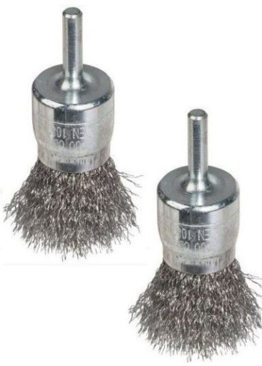 Szczotka wykonana z drutu stalowo karbowanego. Drut o średnicy około 0,3 mm. Uchwyt na wiertarkę (trzpień 6,25 mm). Szczotka stosowana np przy pracach szlifierskich.