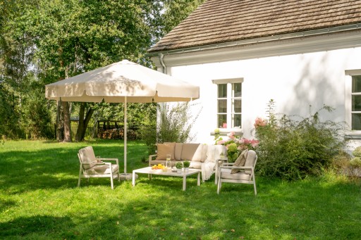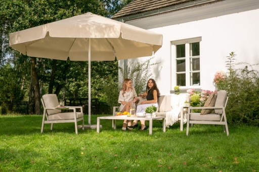 Parasol ogrodowy Rodos z centralną nogą świetnie chroni przed słońcem i wiatrem. Zamów parasole ogrodowe i stwórz w swoim ogrodzie miejsce do relaksu i spotkań z rodziną i znajomymi.