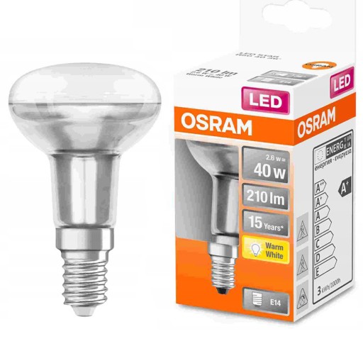 Oferujemy żarówkę LED OSRAM REFLEKTOR R50 2,6W=40W , trzonek E14, strumień światła 210lm, barwa ciepła 2700K