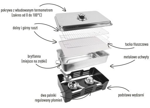 Dwa palniki zasilane paliwem żelowym pozwalają na wędzenie bez dostępu do gazu czy prądu. Wędzenie polega na podgrzewaniu od spodu zrębków wędzarniczych umieszczanych na dnie wędzarni, w efekcie czego wytwarza się dym wędzarniczy. Nadmiar tłuszczu powstającego podczas wędzenia ocieka na specjalną tackę tłuszczową, dzięki czemu nie spala się on, a cała wędzarnia niemal nie generuje dymu. Jednocześnie tacka gwarantuje brak kontaktu paliwa z wędzoną żywnością. Specjalne palniki posiadają regulację płomienia, co pozwala zwiększać lub zmniejszać temperaturę w komorze wędzarniczej. Termometr dołączony do wędzarni pozwala zaś na kontrolę tej temperatury i utrzymanie jej na optymalnym poziomie. Twoje ulubione dania będą aromatyczne i pyszne!