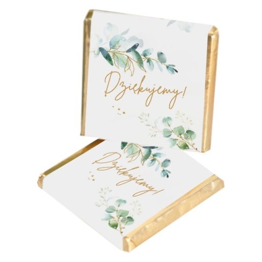 - Czekoladki zapakowane zostały w złotko i ozdobione dwustronnym najmodniejszym motywem gałązki eukaliptusa