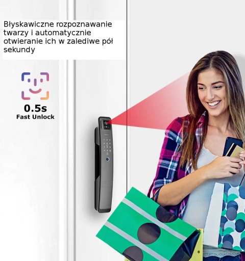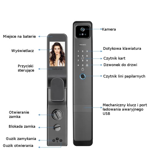 - Metoda odblokowania: APP Bluetooth, karta RFID, odblokowanie kluczem, odcisk palca, Face ID - rozpoznawanie twarzy