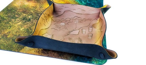 Dice tray jest wykonany z 2mm gumy, znanej z mat do gier karcianych. W narożnikach znajdują się wytrzymałe, plastikowe napy dzięki którym możemy płaską matę zmienić w miseczkę do rzucania koścmi.