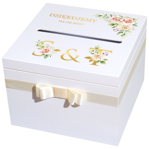 Na wieku napis Dziekujemy ( dekor lakierowany w kolorze złotym), pudełko w około przepasane wstązka z kokardą