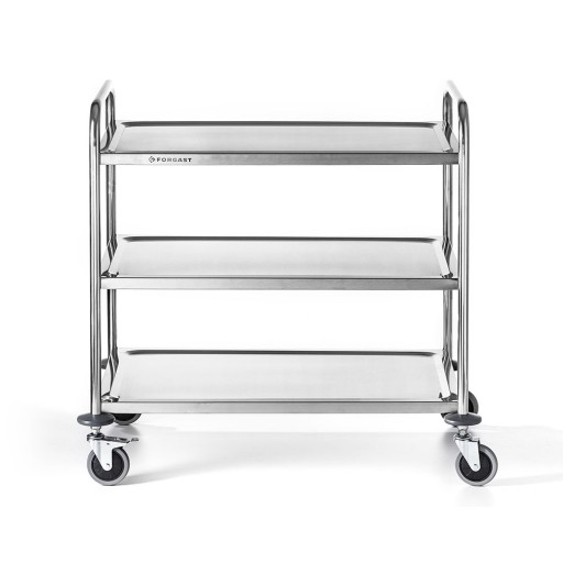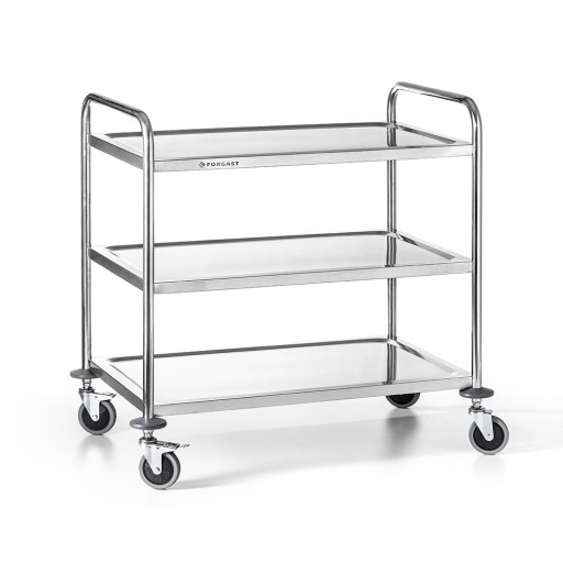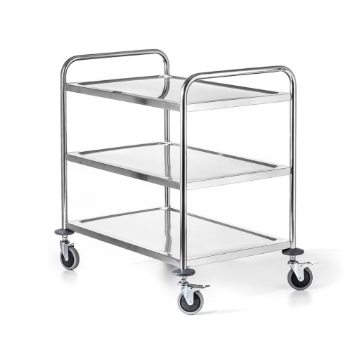 Wózek kelnerski 3-półkowy wykonany ze stali nierdzewnej. Polerowana stal nierdzewna typu 201. Półki wykonane z blachy o grubości 0,7 mm. Okrągłe rurki kształtowników. 4 kółka skrętne, w tym 2 kółka z hamulcami. Solidne i estetyczne wykonanie.