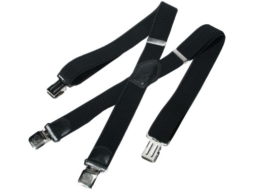 Metalowe klamry mocno trzymają spodnie.