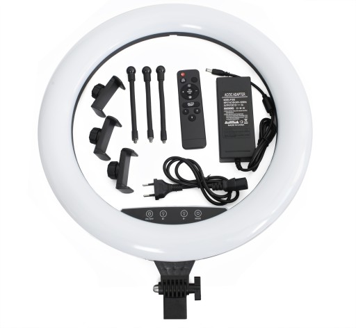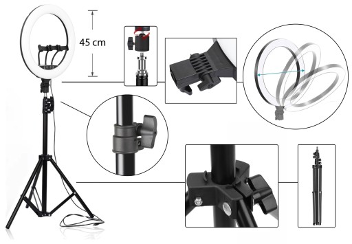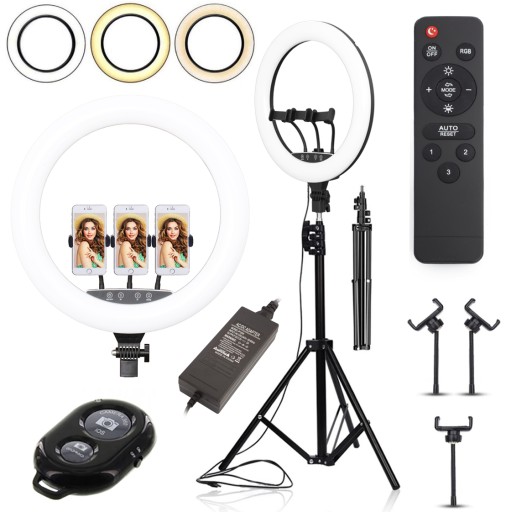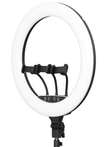 - lampa pierścieniowa LED 240W emitująca 3 odcienie światła z możliwością zamontowania 3 uchwytów na telefon jednocześnie