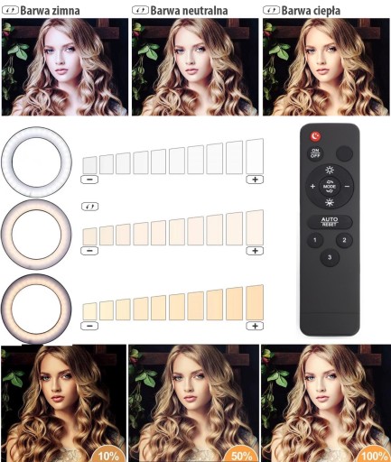 - Dostosowanie barwy i natężenia oświetlenia lampy LED RING 240W odbywa się w dwóch płaszczyznach. Szczegółowy opis funkcji znajduje się w górnej części opisu przedmiotu oferty.