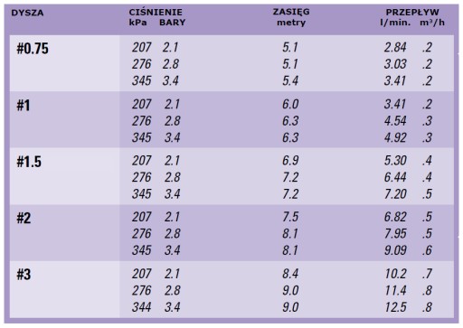 - Wielkość opadu : 5,58 mm do 11,18 mm na godzinę (zależnie od rozstawu i użytych dysz).