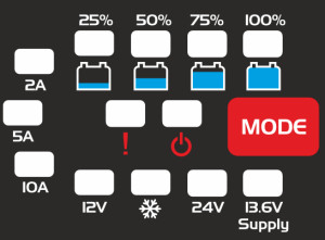 Ładowarka CBC 10 jest przeznaczona do baterii 12V / 24V typu żelowe, kwasowo-ołowiowe, AGM, VRLA, VLA, SLA, WET, GEL, Lead-Acid. Ładowanie przebiega automatycznie, w zależności od trybu nawet w 9 etapach! Tryb ładowania, działanie ładowarki sygnalizowane jest 13 diodami LED.