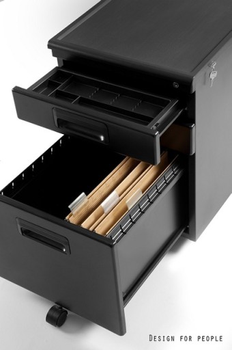 Górna szuflada wyposażona została w organizer, dolna posiada zaczepy pozwalające na zawieszenie akt. Kontener zaopatrzony jest w kółka z hamulcami.