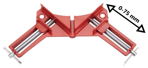 Ścisk kątowy oferuje mocowanie dwóch elementów pod kątem prostym 90°. Maksymalny wymiar mocowanego materiału to 75 mm.