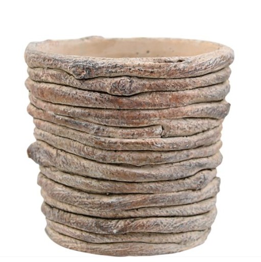 Doniczka wykonana z cementu w odcieniach brązu z szarymi przetarciami. Forma doniczki wygląda jakby była zbudowana lub upleciona z ułożonych gałązek lub wiklinowych patyczków. Prosty kształt i zdobienia imitujące motywy natury będą przyjemnym dla oka dodatkiem, który uzupełni charakter dowolnego wnętrza.
