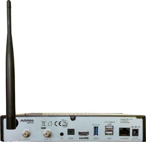 - Ports: AV, HDMI 2.0a HDCP 2.2, HDCP1.4, USB 2.0, USB 3.0, S/PDIF, LAN 10/100/1000Mbit, DC 12V/3A, DVB-S2, Smart Card Slot